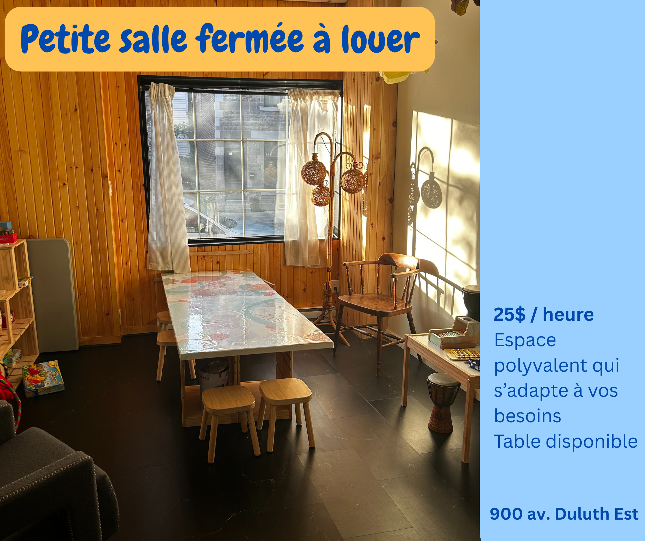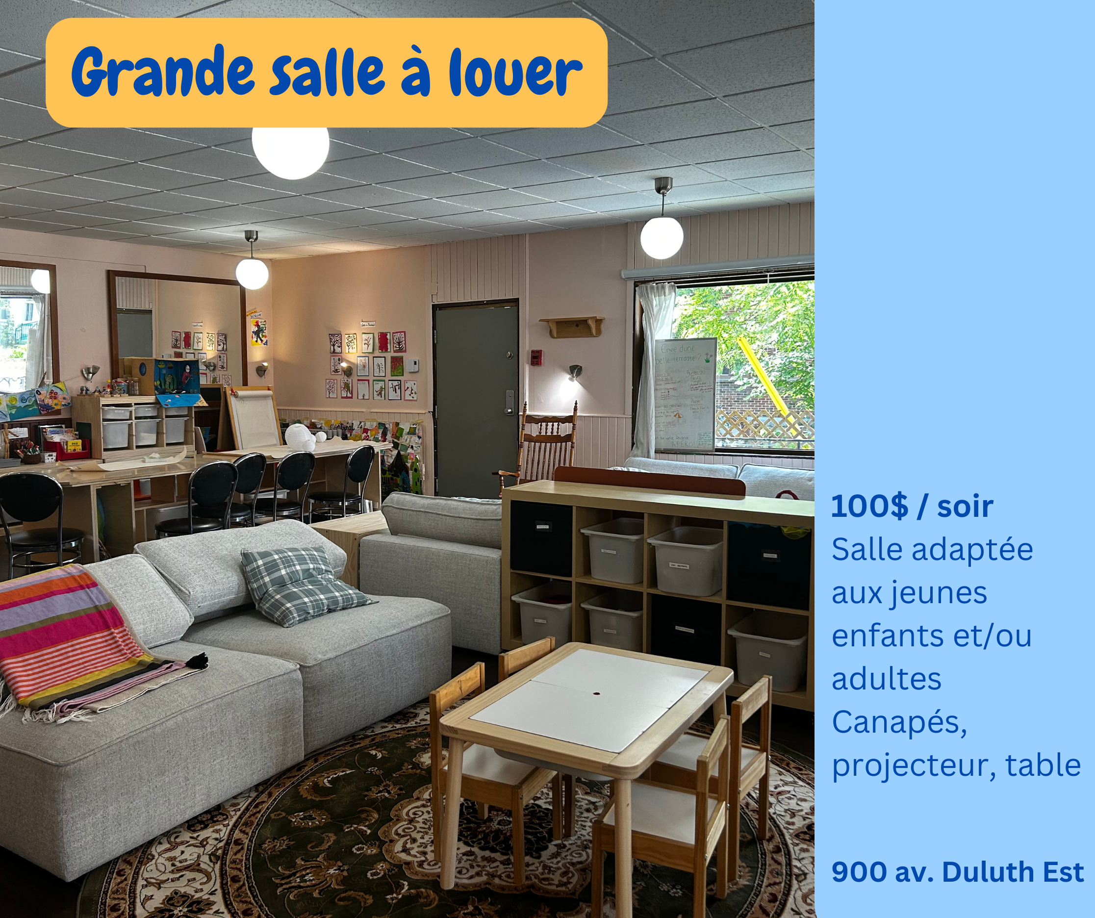 Note petite salle : Il est possible d'inviter plus que 10 personnes en partageant l'espace commun avec les autres familles prsentes. Le prix inclu 10 personnes, des frais de 15$ par famille en plus.