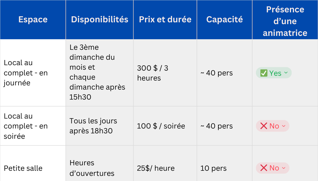 la privatisation complète du Local Familial (de jour ou en soirée) ou la location de notre petite salle fermée.